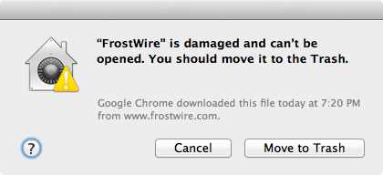 Users that upgraded to Mac OSX 10.8 or who recently got a new Mac will probably get a nasty message that won’t let them run FrostWire.