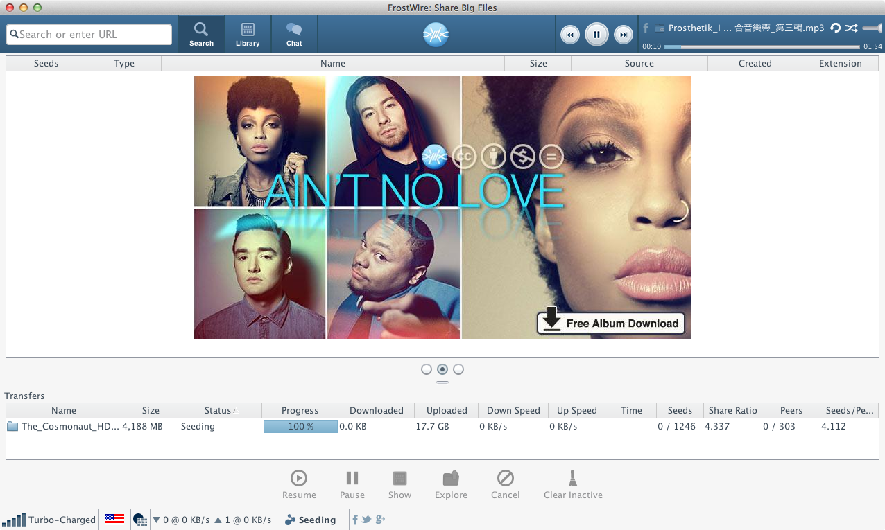 Now we let you know something we always did, FrostWire always searches for all kinds of files, in the past this wasn’t obvious. See the number of search results per file type shown at the top of the search results, click on those buttons to show the found files for that type.