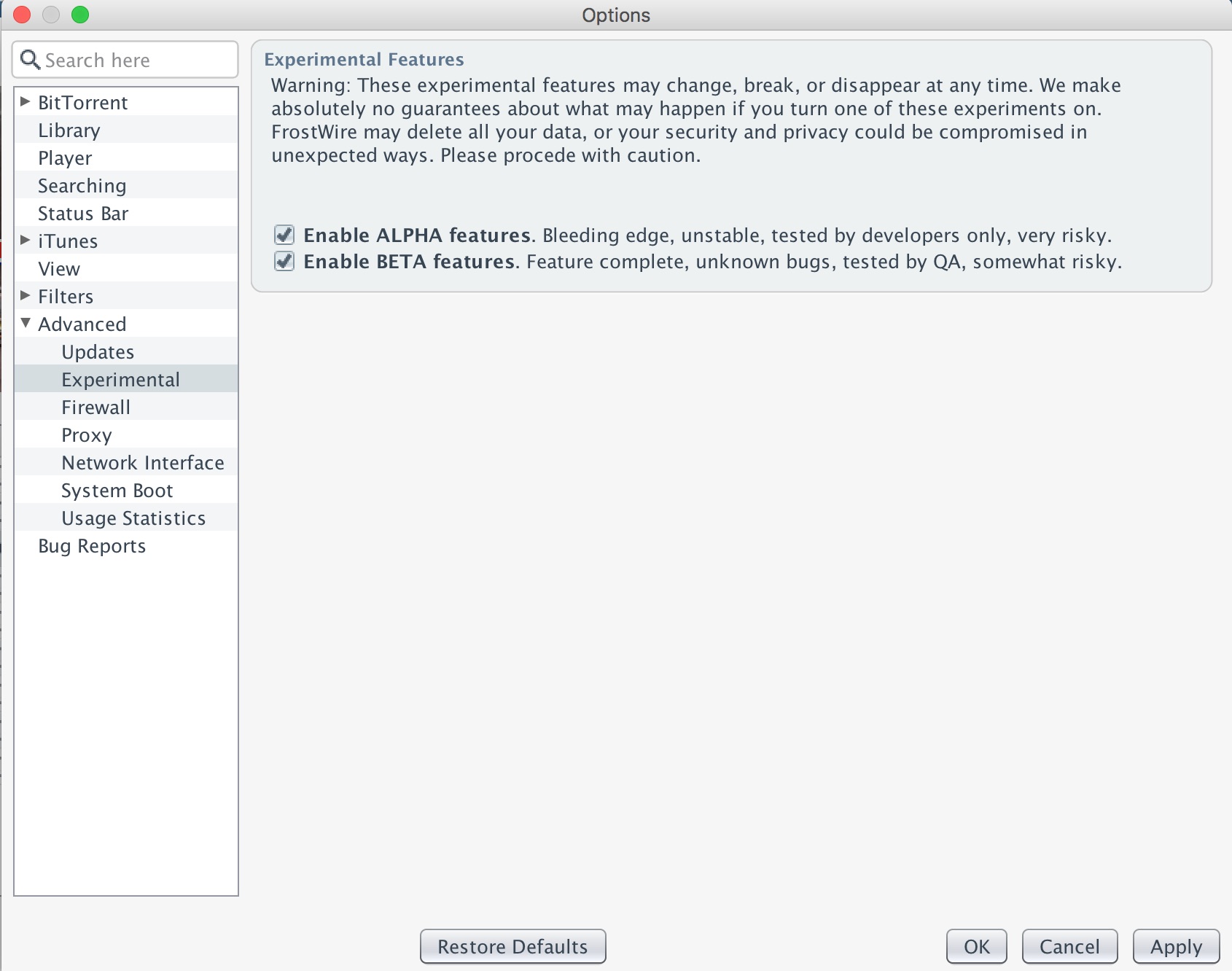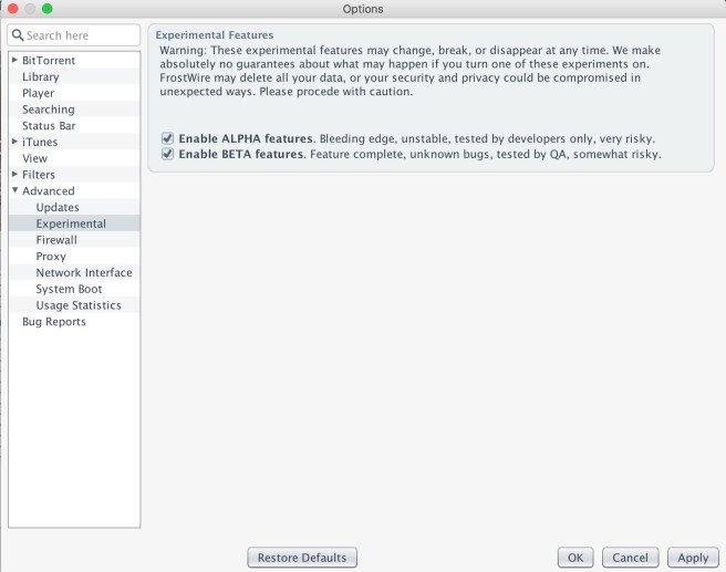 Starting FrostWire 6.4.6 you can try experimental features at your own risk.