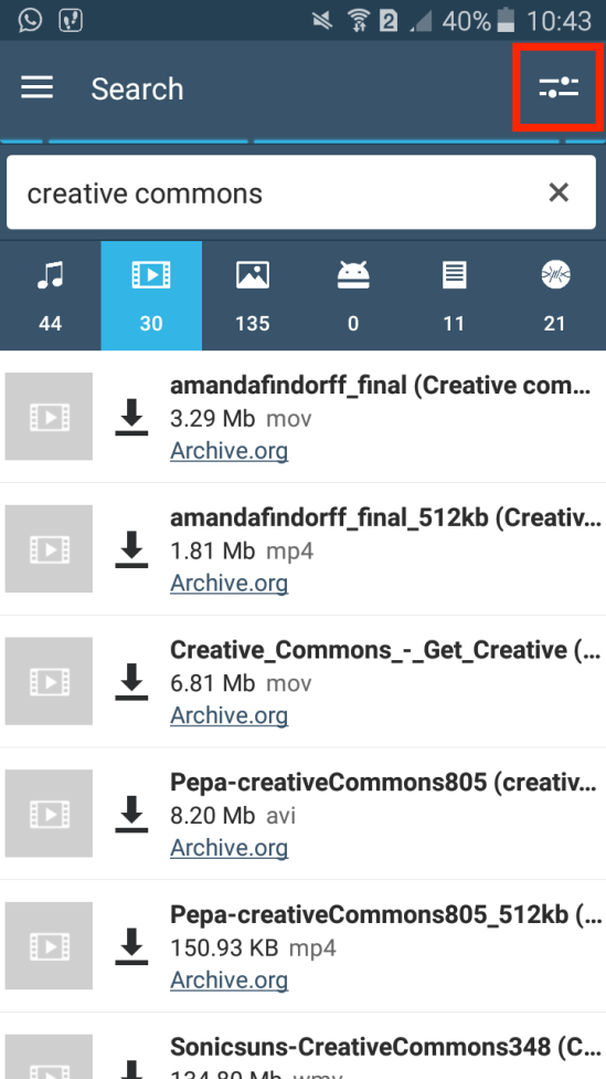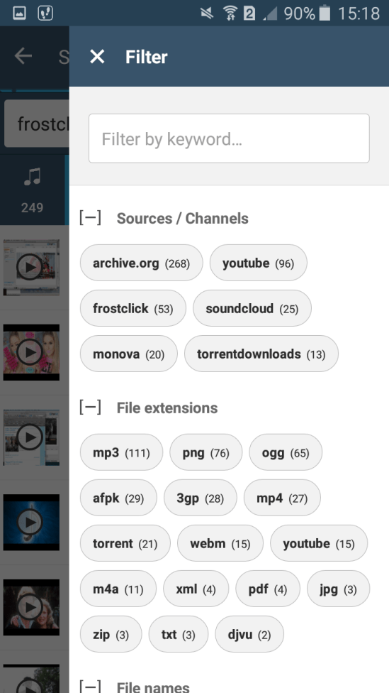 First of all, FrostWire for Android now have search filtering tools. What is that? Search Filtering Tools allows you to get better search results. After you do a search you can filter it (by keyword, source, file extension,etc) in order to get more accurate results.