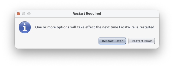 When you change settings that require a restart (language, theme, network mode), FrostWire now shows a “Restart Now” / “Restart Later” dialog instead of just a passive message.