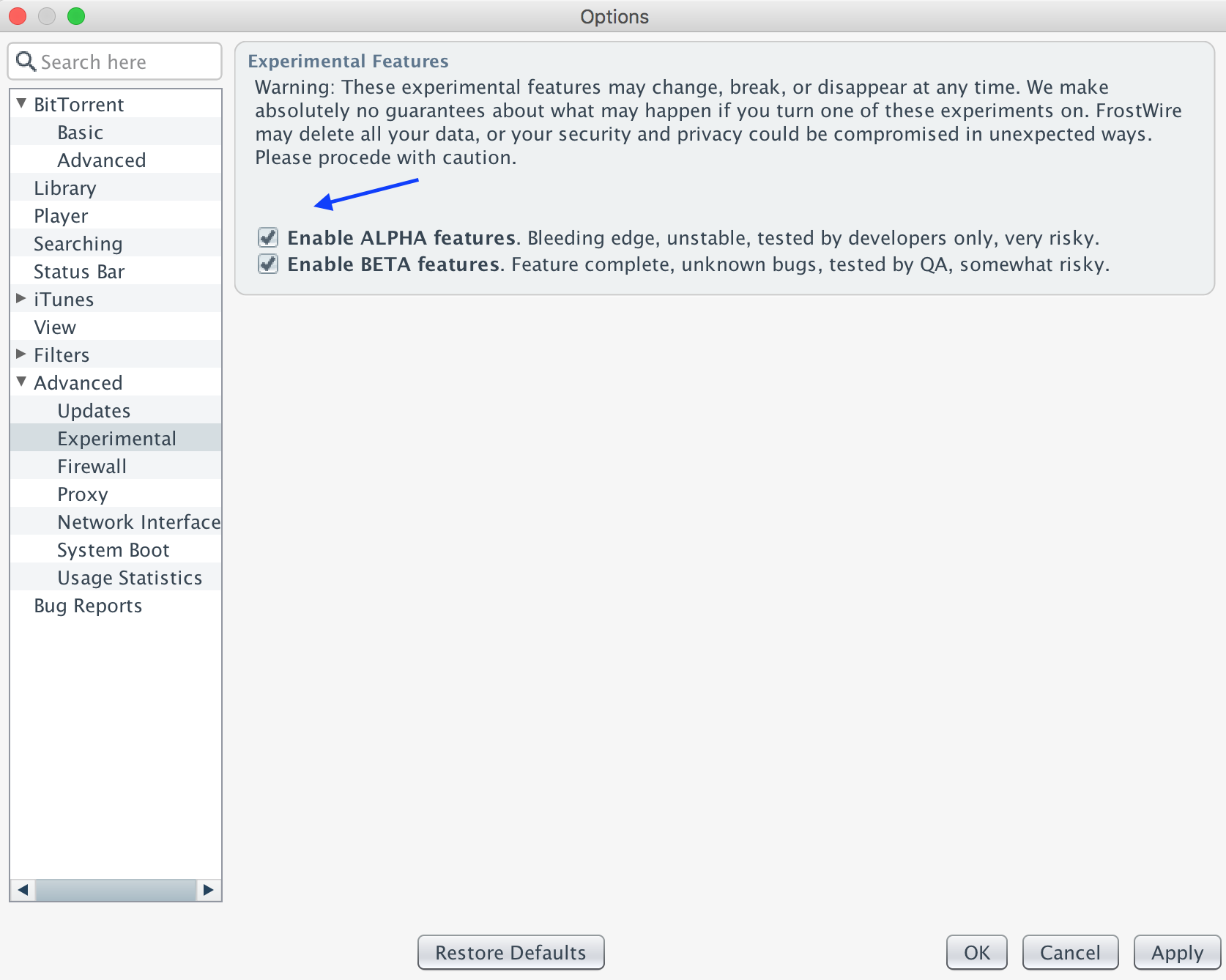 Starting FrostWire 6.4.6 you can try experimental features at your own risk.